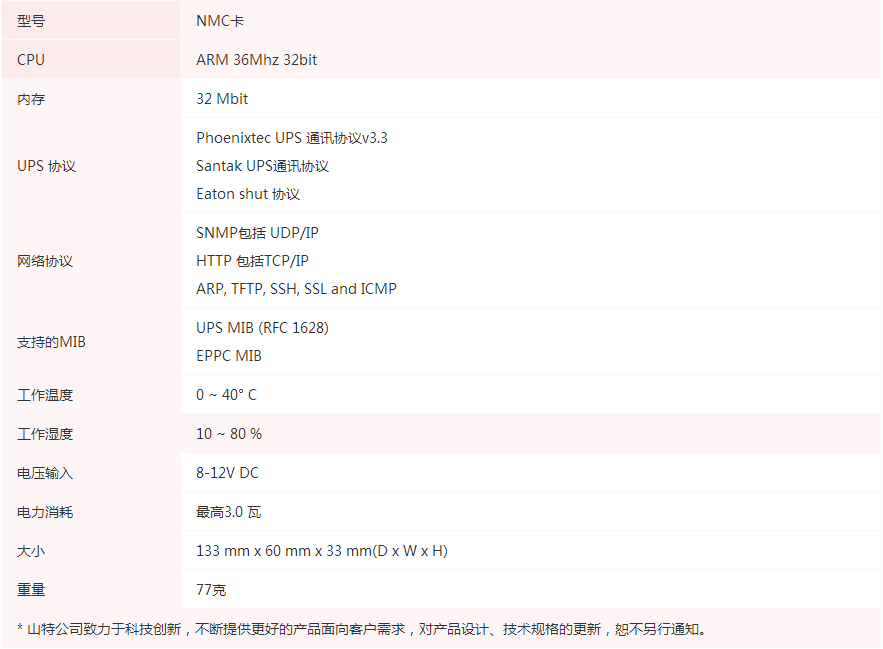 NMC 是一種介于UPS和網(wǎng)絡(luò)的設(shè)備,它可以從UPS獲得狀態(tài)息并且發(fā)出指令。NMC支持兩種協(xié)議-簡(jiǎn)易網(wǎng)絡(luò)管理協(xié)議(SNMP)和超文件傳輸協(xié)議(HTTP)以供使用者進(jìn)入。通過(guò)SNMP的網(wǎng)絡(luò)管理站(NMS)和網(wǎng)頁(yè)瀏覽器,用戶(hù)可以獲得UPS的狀態(tài)息、發(fā)出指令至UPS并且通過(guò)網(wǎng)絡(luò)設(shè)定NMC